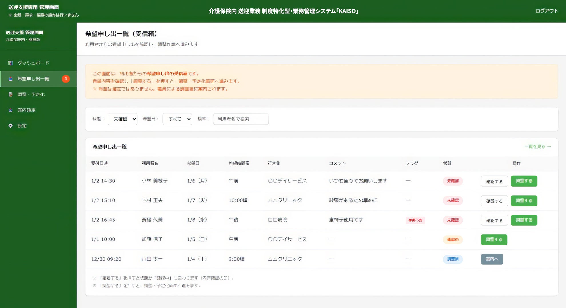 送迎の調整・判断・確定は 管理者のみ が行う設計としています。