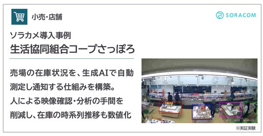 また、AI活用の裾野を広げる「AI/IoTの民主化」という観点では、IoTシステムの自動化を実現する「SORACOM Flux」や、ソラカメの映像に直接生成AIによる分析をおこなうことができる「ソラカメAI」にAIを統合し、製造業、小売業、物流業など、さまざまな業界の現場主導のAI活用を支援しています。すでに、大塚倉庫株式会社では、カメラと生成AIを活用した 倉庫の侵入検知システムが稼働しており、生活協同組合コープさっぽろでは、売場の惣菜の在庫状況を、カメラと生成AIで自動測定し通知する仕組みとして活用が始まっています。