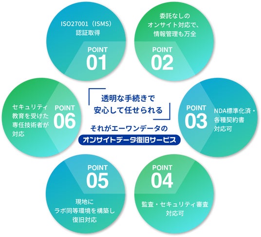 - 現地対応による安全・確実な復旧作業高いセキュリティが求められる現場でも、エーワンデータの専門エンジニアが現地で直接復旧作業を行います。物理的な機器の移送が不要なため、情報漏洩リスクを抑えられます。