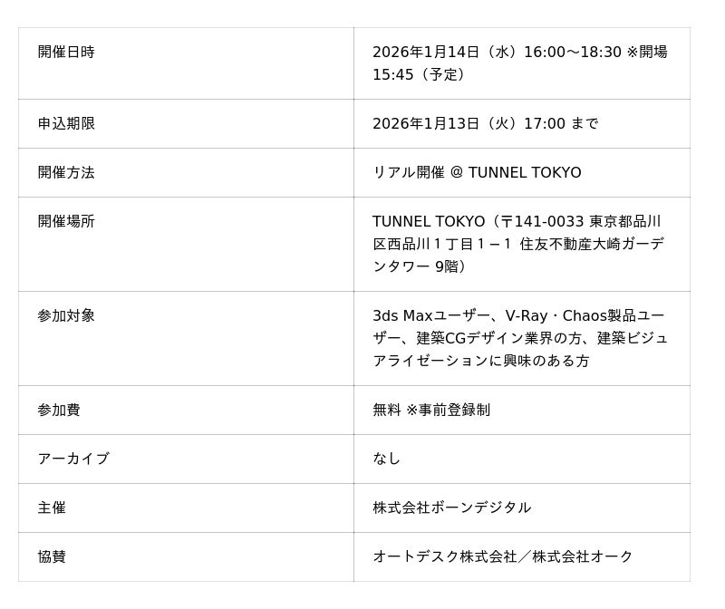 株式会社ボーンデジタル(本社:東京都千代田区、CEO:新 和也、URL:https://www.borndigital.co.jp/)は、建築ビジュアライゼーションに携わるクリエイター・デザイナーを対象としたリアルイベント「ZOA Studio流:魅力的なアニメーションのつくり方 + リアルで教えて公式先生!(3ds Max & Chaos/建築VIZ編)」を、2026年1月14日(水)に TUNNEL TOKYO にて開催いたします。