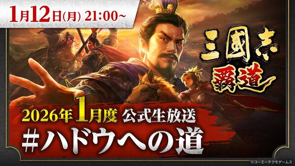 コーエーテクモゲームスは1月5日、iOS/Android/PC(Steam/Google Play Games)にてサービス中のMMO戦略シミュレーションゲーム『三國志 覇道』について、生放送番組「『三國志 覇道』1月度公式生放送 #ハドウへの道」の実施を決定したと発表。配信日時は、2026年1月12日21時より。