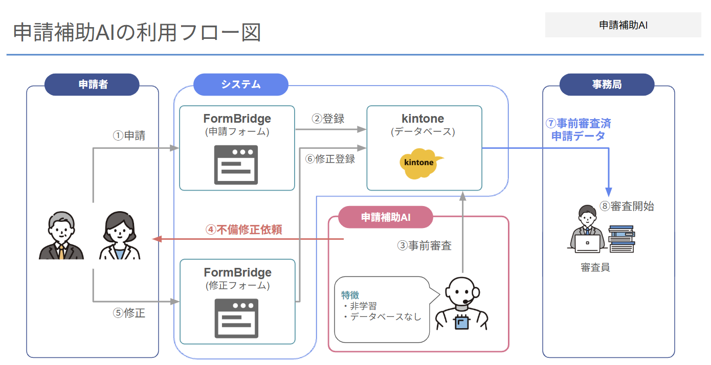 本サービスは、給付金・補助金などの申請書類に対する一次審査の前段階(事前審査)をAIが担い、書類チェックや不備抽出、修正依頼といった“下ごしらえ”を自動で実行するものです。人間による最終判断を前提としながらも、前処理の時間を大幅に削減することで、審査業務全体の効率化を実現します。