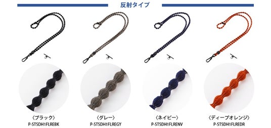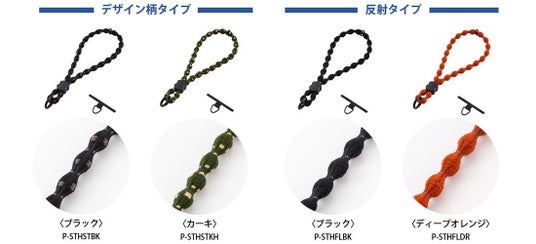 - ハンドストラップとショルダーストラップの2種類、それぞれにデザイン柄タイプと反射糸を採用した反射タイプをラインアップしています。