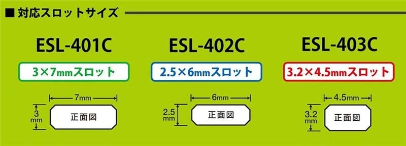 - 対応スロットサイズ(※):[ESL-401C]3×7mmスロット、[ESL-402C]2.5×6mmスロット、[ESL-403C]3.2×4.5mmスロット