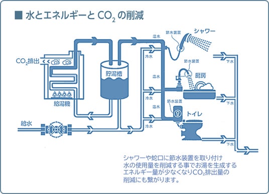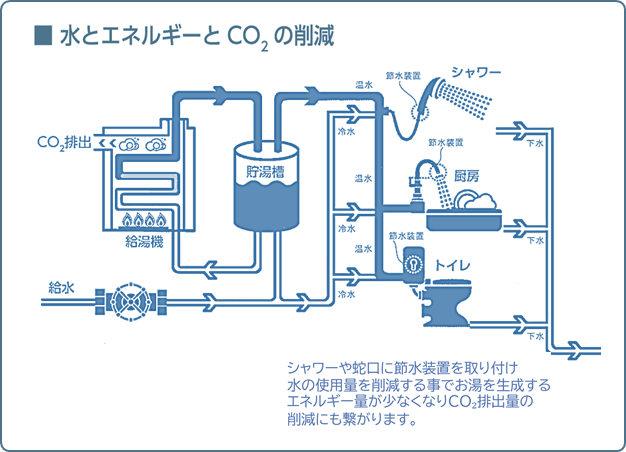 水はピュアな循環の象徴ですが、その供給や処理にはかなりのエネルギーが間接的に消費されています。加えて、給湯など加温時には直接燃料等を使うことになります。家庭部門の場合、給湯(お風呂と厨房)にともなうCO2は13%、上下水道は2%と全体に占めるCO2排出が15%を占めます。オフィス・病院・ホテルなどの業務部門でも10%程度を占めるなど、このように節水に取り組むことで、水資源の保全とCO2削減が同時に貢献ができます。