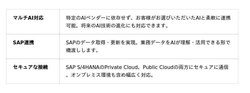 当社はSAP導入・運用で培った深い業務理解と最新の生成AI技術を融合し、お客様に最適なAI活用をご提案します。本製品は特許出願中の独自技術を活用し、Claude、ChatGPT、Gemini、Copilotなど任意の生成AIとSAPをセキュアに接続することが可能です。