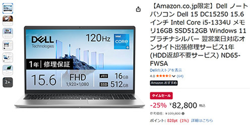 15.6インチノートPC 「Dell 15 DC15250(ND65-FWSA)」が、Amazonタイムセールに登場しました。参考価格109,800円のところ、25%オフの82,800円で販売中です。