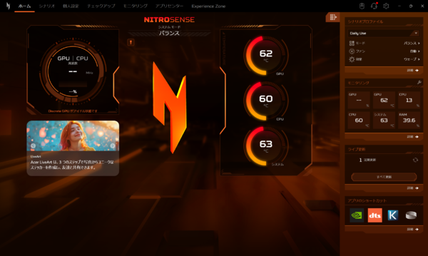 NitroSenseは、CPUやGPUの状態、ファンの回転数、動作モードを一元管理できるツール。専用キーからすぐに呼び出せるため、状況に応じて動作を切り替えられます。