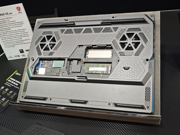 目を惹くのはそのフラッグシップ級の電力供給です。CPUが125W、GPUが175Wの合計300Wというシステム電力でこのノートPCを動かします。その電力で熱くなった本体は3基の吸気ファンと5つの排気口で冷却します。CPUにIntel Core Ultra 200HXシリーズ(Arrow Lake HX)、もしくはAMD Ryzen 9 9955HX3D、GPUにNVIDIA GeForce RTX 5090を搭載するので、動かないゲームはありません。