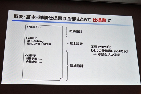そこで、概要・基本・詳細のフェーズごとの仕様書をひとつのファイルにまとめた。一続きの仕様書にして修正の手間を減らすと、不整合はなくなったという。