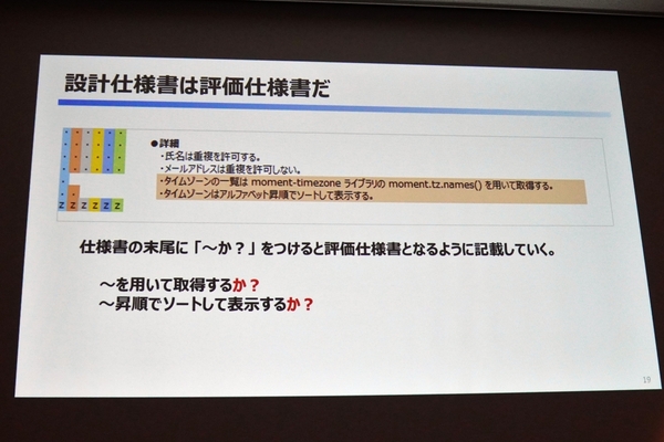 もうひとつ意識していたのが、「設計仕様書は評価仕様書でもある」という考え方だ。文章の末尾に「~か?」をつけると評価仕様書になるような、“テストファースト”な記述を徹底した。