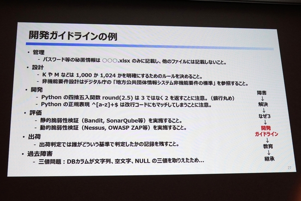この開発ガイドラインとは、プロジェクトをまたがり蓄積してきたナレッジをひとつのファイルに集約したものだ。「障害があって、解決して、“なぜ3分析(なぜ?を繰り返す問題解決手法)”をする。喉元を過ぎれば忘れてしまうので、開発ガイドラインに追加して、10年先のメンバーにもノウハウを伝える」と杜甫々さん。
