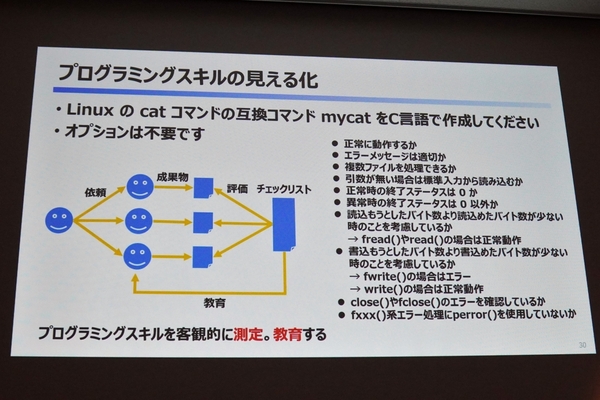 プログラミングスキルの見える化にも取り組んでいた。それは、「Linuxのcatコマンドの互換コマンドmycatをC言語で作成してください」と投げかけるという内容だ。「これだけのお題だが、完璧に作れる人は少ない。異常時の終了ステータスが0以外になっているか、close()のエラーを確認しているかなど色々なチェック項目を設けていた」と杜甫々さん。