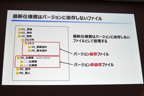 さらに、「リリースが終わればバージョン依存のフォルダは捨てるくらいの気持ち」で運用するのがよいという。結局のところ、重要なのは「最新の仕様」であり、10年後に保守しているメンバーは、古いバージョンの仕様など読まないからだ。