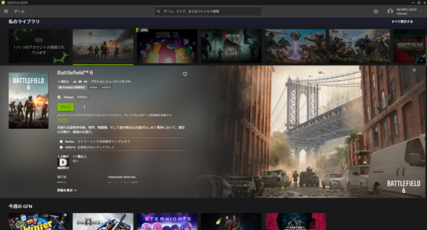 アカウントが接続できたら、ライブラリーからバトルフィールド6を選択して、プレイボタンを押すだけ。どのデバイスでも、問題なくサクッとプレイが開始できました。