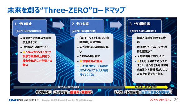 奥野氏は、自身が提唱する「スリーゼロ」というロードマップを用いながら、AIによる自動防御の未来図を語った。第一段階は「ゼロ停止」。攻撃を受けてもシステムや事業を止めないレジリエンスの確保だ。