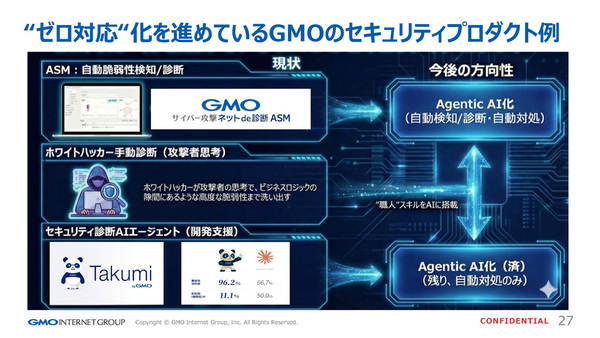 GMOイエラエでも、この流れを汲んだ製品開発が進められている。自社開発の攻撃面管理ツール「ASM」や、開発者支援ツール「Takumi」にエージェンティックAIを搭載し、脆弱性の自動検知から自動対処までを実現しようとしているのだ。