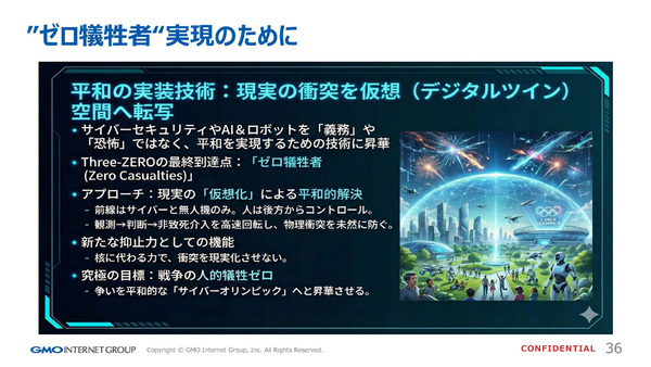 奥野氏が提示したのは、仮想空間の活用による平和的解決というビジョンだ。物理空間での衝突を避け、デジタルツイン上でのシミュレーションや競争によって国家間の摩擦を解消する。SFのような発想だが、技術的には射程圏内に入りつつあるという。