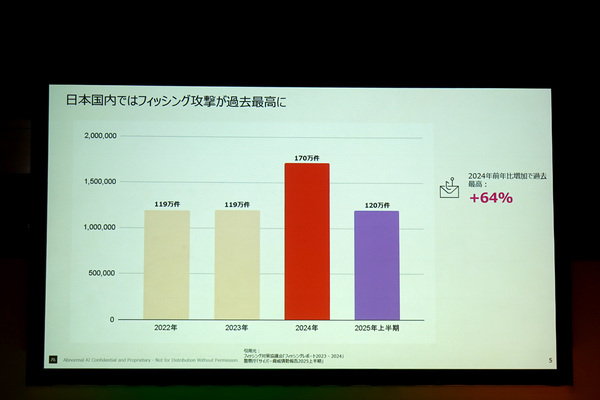 電子メールというインフラは、1990年代の普及以来、ビジネスコミュニケーションを支え続けているが、同時に攻撃者にとっても格好の侵入経路となっている。日本国内におけるフィッシング攻撃の件数は増加の一途をたどっており、2022年から2023年にかけては約119万件で推移していたが、2024年には過去最大級となる170万件に達したという。さらに、警察庁が発表したレポートでは、2025年上半期で120万件を超えており、年間では昨年の記録を大幅に更新することは間違いない。