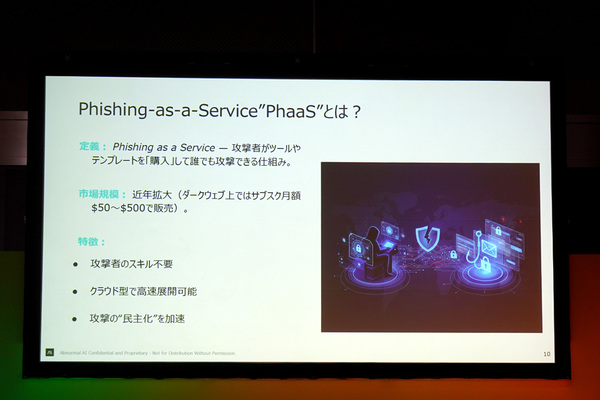 「PhaaSは攻撃者がツールやテンプレートを購入して誰でも攻撃できる仕組みで、まさにフィッシング攻撃を大量に生成するためのツールです。近年、ダークウェブ上で拡大しており、サブスク形式で50ドルから500ドルという手頃な価格で利用できます。攻撃者には特にプログラムのスキルが必要なく、インフラもPhaaSが提供するので、クラウドで高速展開が可能になっています。まさにサイバー攻撃の民主化が加速しているような状態です」(日原茂氏)