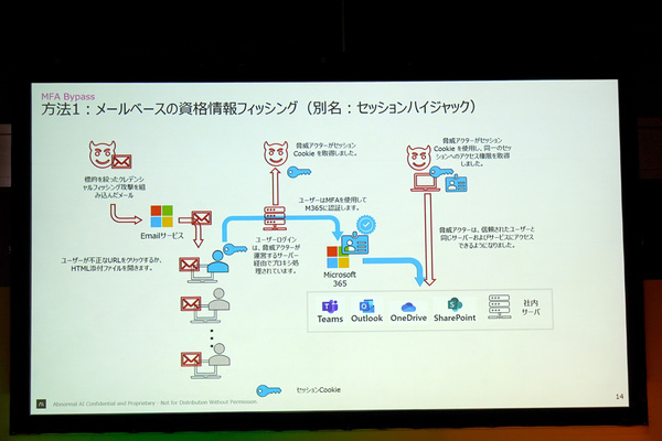 「攻撃者が、クレデンシャルフィッシング攻撃を組み込んだメールを特定の組織に対して大量に送ります。その中で、1人でもメールにあるURLやHTMLの添付ファイルを開いてしまうと、アカウント情報の認証ページが表示されます。このページは本当のページですが、実際は攻撃者が運営するサーバーが間にあり、プロキシ処理が行われています」(日原茂氏)