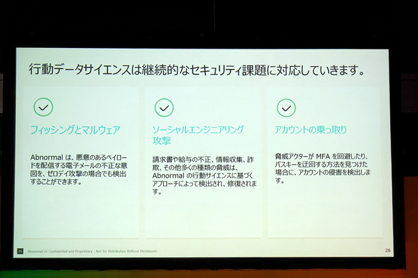 「カスタマーデータや取引先のデータなどから、ログのイベントやID情報、どういったメールを書いているのか、どういった権限を持っているのか、どういったビジネスの役割を持っているのか、といった情報をAIに学習させることで、5万以上の行動シグナルを取り込むことができます」(日原茂氏)