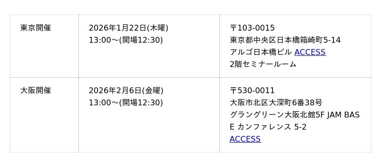 東京/大阪ともに対面開催/参加無料・事前登録制。