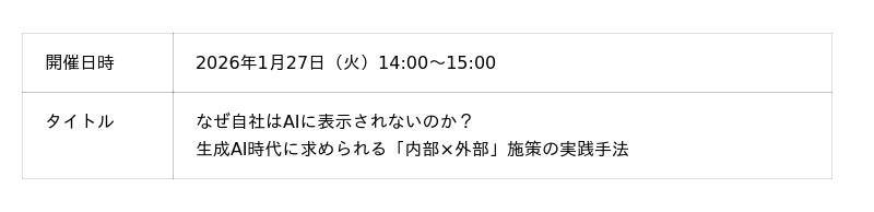 本協業体制の構築に伴い、2026年1月27日(火)に3社共催によるオンラインセミナーを開催いたします。生成AI時代の最新AIO戦略や具体的な活用事例について、各社の知見を集約し、実践的なノウハウをご紹介いたします。