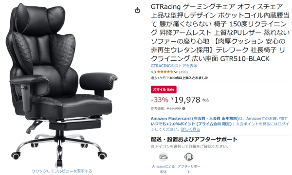 GTRACING「GTR510」の参考価格は29,999円ですが、セールでは33%オフの19,978円という割引価格で手に入ります。