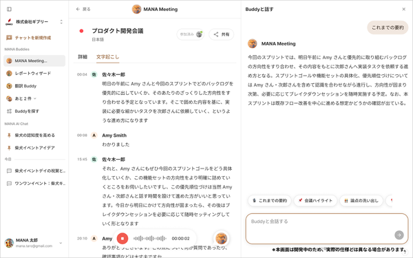「MANA Meeting」は、Web会議の進行を支援するAIエージェント。Web会議(Google Meet、Microsoft Teams、Zoom)を録画するとともに音声をリアルタイムに文字起こしし、AIが会議中の発言内容をその場で整理。議論のテーマや論点の可視化、決定事項/未決事項の整理、次に確認すべきポイントの提示を行うという。