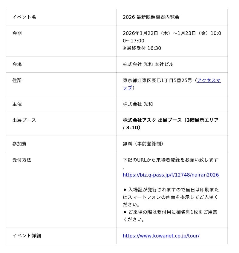 株式会社アスク(本社:東京都千代田区)は、2026年1月22日(木)・23日(金)に株式会社光和 本社ビルにて開催される「2026 最新映像機器内覧会」に出展します。