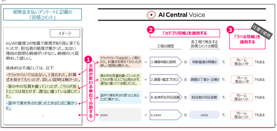 図:「同じ文脈となる文章のまとまり単位」で、集計軸となるカテゴリ・ラベルを設定する技術のイメージ
