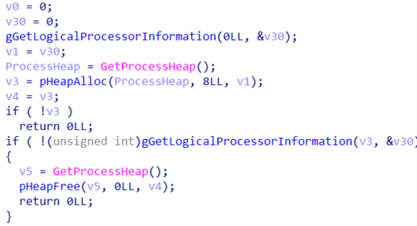2. CPU環境:シングルコアまたは最小限のCPU構成(サンドボックスやVMによく見られる)を検知します。GetLogicalProcessorInformation()を使ってシステムの論理プロセッサエントリを取得し、プロセッサコアエントリがいくつあるかをカウントして、カウントが2未満の場合は下位バイトが1の値、それ以外の場合は下位バイトが0の値を返します。