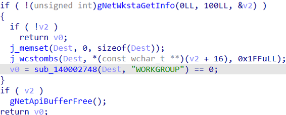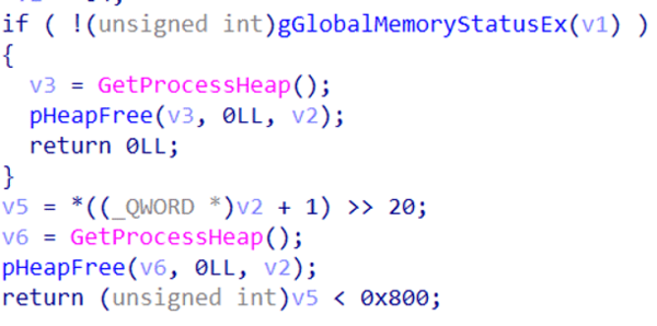 3. メモリとディスクのサイズ:RAMが2048 MB未満であるかどうかをチェックするために、GlobalMemoryStatusExを使ってシステムのメモリ情報を読み取り、総物理メモリサイズをメガバイト単位で算出して、システムのRAMが0x800(2048)MB未満であるかどうかを判別します。