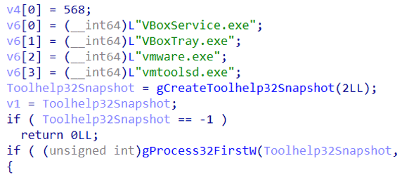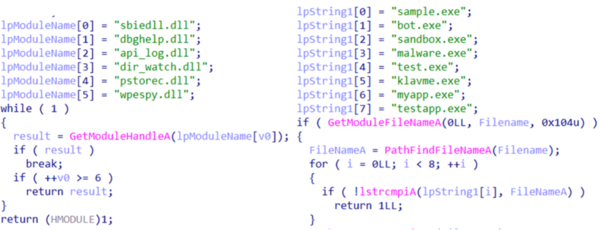 9. ファイル名のチェック:ファイルが分析環境で実行されているかどうかを判別します。GetModuleHandleAを呼び出して名前をチェックし、sbiedll.dll、dbghelp.dll、api_log.dll、dir_watch.dll、pstorec.dll、およびwpespy.dllを検索します。また、稼働中の実行ファイルのファイル名を明らかなテスト / サンプル名(sample.exe、sandbox.exe、malware.exeなど)の短いリストと照合してチェックします。