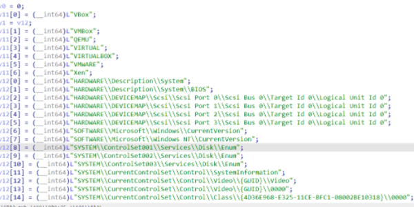 7. レジストリのスキャン:大規模なレジストリベースの仮想マシン検知ルーチンを実行します。このルーチンは、HKEY_LOCAL_MACHINEの下にある16のレジストリパスを順に反復処理していきます。これらのパスには通常、BIOS、ディスク、動画アダプタ情報などのハードウェアおよびシステム識別子が格納されています。各キーについてデフォルトのレジストリ値を問い合わせ、既知の仮想化ベンダー識別子VBox、VMBox、QEMU、VIRTUAL、VIRTUALBOX、VMWARE、Xenなどと一致する部分文字列を検索します。