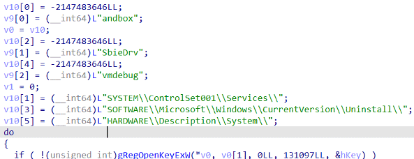 8. サンドボックスの検知:既知のサンドボックスツールやデバッグツールがないか検索します。GetModuleHandleAを呼び出して、既知の分析 / サンドボックス DLL (sbiedll.dll、dbghelp.dll、api_log.dll、dir_watch.dll、pstorec.dll、wpespy.dll)を検索します。その後、複数のシステムパス (SYSTEM\ControlSet001\Services、SOFTWARE\Microsoft\Windows\CurrentVersion\Uninstall、HARDWARE\Description\System)の下にあるレジストリサブキーをチェックして、"sandbox"、"SbieDrv"、"vmdebug"などの部分文字列を含む名前を検索します。