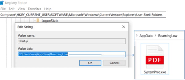 マクロの実行が成功すると、UDPGangsterが自身をSystemProc.exeとして%AppData%\RoamingLowにコピーし、永続性を確立します。その後、次のレジストリキーの下にあるStartupの値にパスを書き込むことで、スタートアップを設定します。