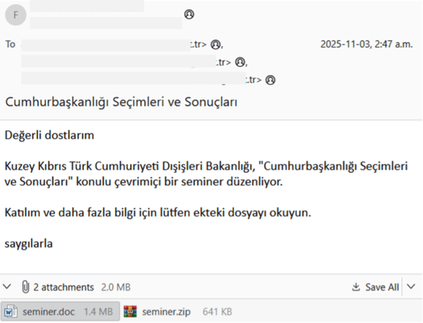 使用されたフィッシングメールは、北キプロス・トルコ共和国外務省を装っていました。このメールは、「Presidential Elections and Results(大統領選挙と結果)」と題したオンラインセミナーに受信者を招待するという内容で、seminer.docとseminer.zip.という2つのファイルが添付されていました。送信者のメールアドレスとメッセージの書式は政府の公式メールに似せてあり、文章は公用トルコ語で書かれています。