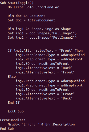 VBAコードは、2つの画像オブジェクト(FullImage1とFullImage2)を操作するSmartToggle()という名前のサブルーチンを定義します。このスクリプトは、AlternativeTextプロパティを"Front"と"Back"の間で切り替えることで、画像の表示順を切り替えます。どちらの画像を前面に表示するかに応じて、ZOrderを使って一方の画像を前面に移動し、もう一方の画像を背面に移動します。