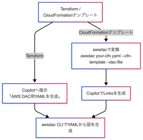 --dac-file:構成図に変換するときにawsdacのYAMLファイルを生成するときにつけるオプションです。これをつけない場合、構成図のみが生成されます。