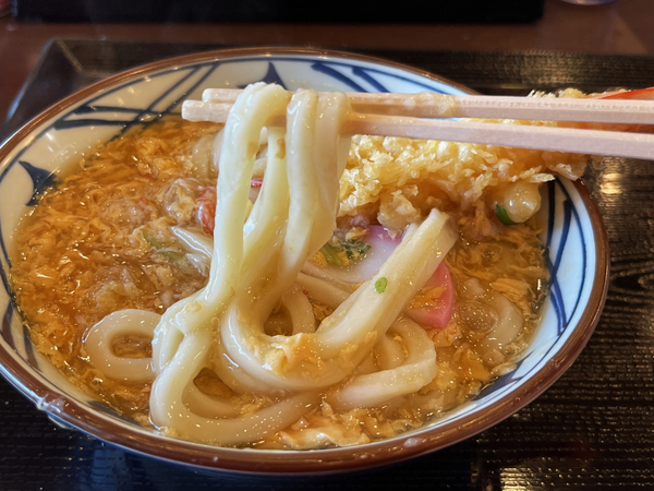 麺は、もちもちとした茹でたてのうどん。年明けうどんは冷水で締めない“釜抜き”で提供されるため、やわらかさが際立ち、玉子あんかけのとろみのあるスープと自然になじみます。