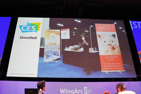 これも試作を持って回ると、ぬいぐるみメーカーがコラボをしてくれまして、それをCESに持ち込みました。最新技術に取り囲まれる中、ただ甘噛みするロボットが色々なメディアで取り上げられました。