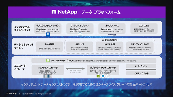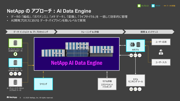 チーフ テクノロジー エバンジェリスト 神原豊彦氏:お客さまのデータをAI Readyなものにするために、新たに「NetApp AI Data Engine」が組み込まれています。AIモデルが読み込めるデータにするためにはさまざまな事前処理が必要ですから、それをわれわれのデータ基盤側でやってしまおうと。たとえばデータのベクトル化や、メタデータの管理といったものですね。