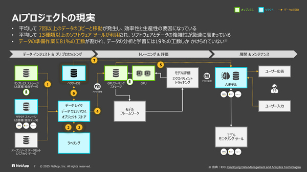 神原氏:従来のAIモデルのトレーニングでは、この図(図A)のようなプロセスが必要でした。左にある各種ストレージからデータをデータレイクに集め直し、ラベリングやベクトル化をしてGPUクラスタにつないで……と、準備作業の間に何度もデータのコピーや移動が発生し、多数のツールを使うことになります。この中間処理の部分をAI Data Engineが引き受けることで、ネットアップのデータ基盤内で一括管理することができます(図B)。