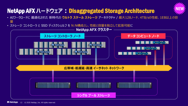 そこで今回リリースしたのが「NetApp AFX」という新しいモデルのストレージです。エンタープライズAIワークロード向けストレージとして、たとえばI/Oスループットは4TB/秒、扱えるデータセットの容量は1EB(エクサバイト)以上と、徹底的にAI向けのチューニングが施されています。分散アーキテクチャを採用しており、構成可能なノード数も最大128ノードまで拡大しています。