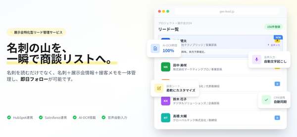 ジンベイ株式会社は1月7日に、展示会におけるリード獲得と管理業務を効率化するサービス「GenLead(ジェンリード)」の提供開始を発表した。展示会ブースでの名刺情報やヒアリング内容を自動的にデータ化し、SalesforceやHubspotなどの主要CRMと連携。名刺を読み取るだけでなく、名刺・展示会情報・接客メモを一体で管理するという。