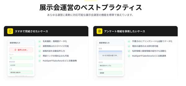 BtoBマーケティングにおいて、展示会は有力なリード獲得チャネルとなる一方、現場では十分に活かしきれていないケースも少なくないと同社は指摘する。例えば、名刺情報やヒアリングメモを手作業で整理する必要があるため、担当者の負担になりがちで、リード情報が営業現場に共有されるまでに時間を要するケースもあるという。