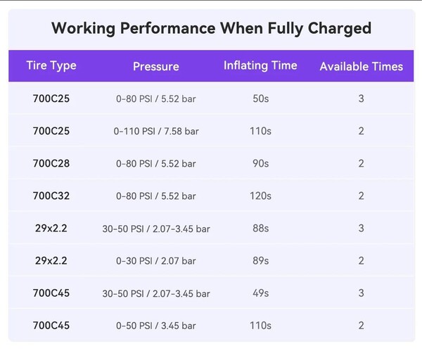 AS2 Ultraの最大の魅力は、約87gと小型軽量なのにタイヤ2本をフル充填できること。現在のロードバイクで主流の、幅28Cのタイヤなら80 PSIまで充填するのに約90秒、32Cなら同様に120秒で充填できます。そして、フル充電ならなんと2回(2本ぶん)充填可能です。
